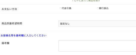 ⑤ 銀行振込にチェック、商品到着希望時間は指定なしで構いません。備考欄にご利用されるお客様のお名前を入力下さい ※必須